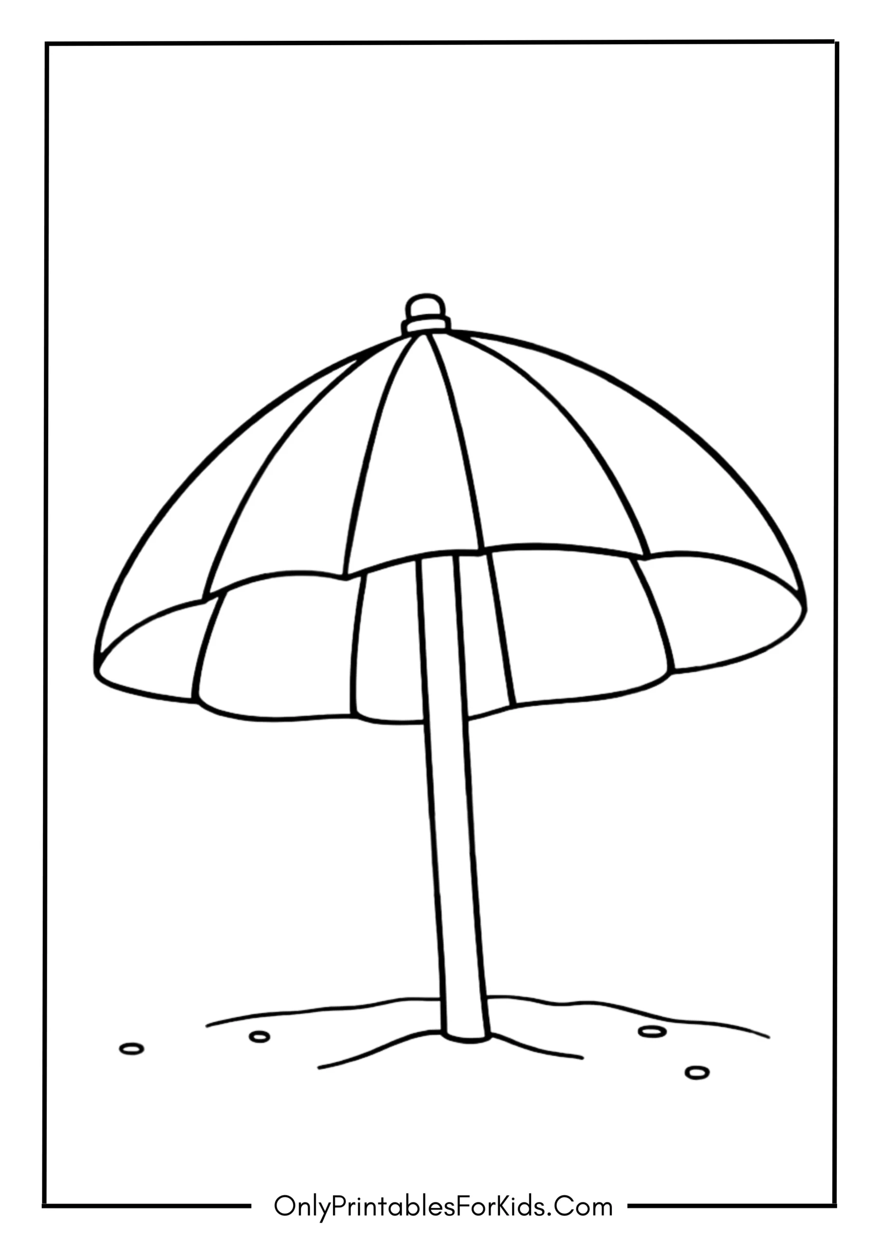 This page shows a big beach umbrella in the sand. Kids can color the umbrella with stripes and the sand yellow.