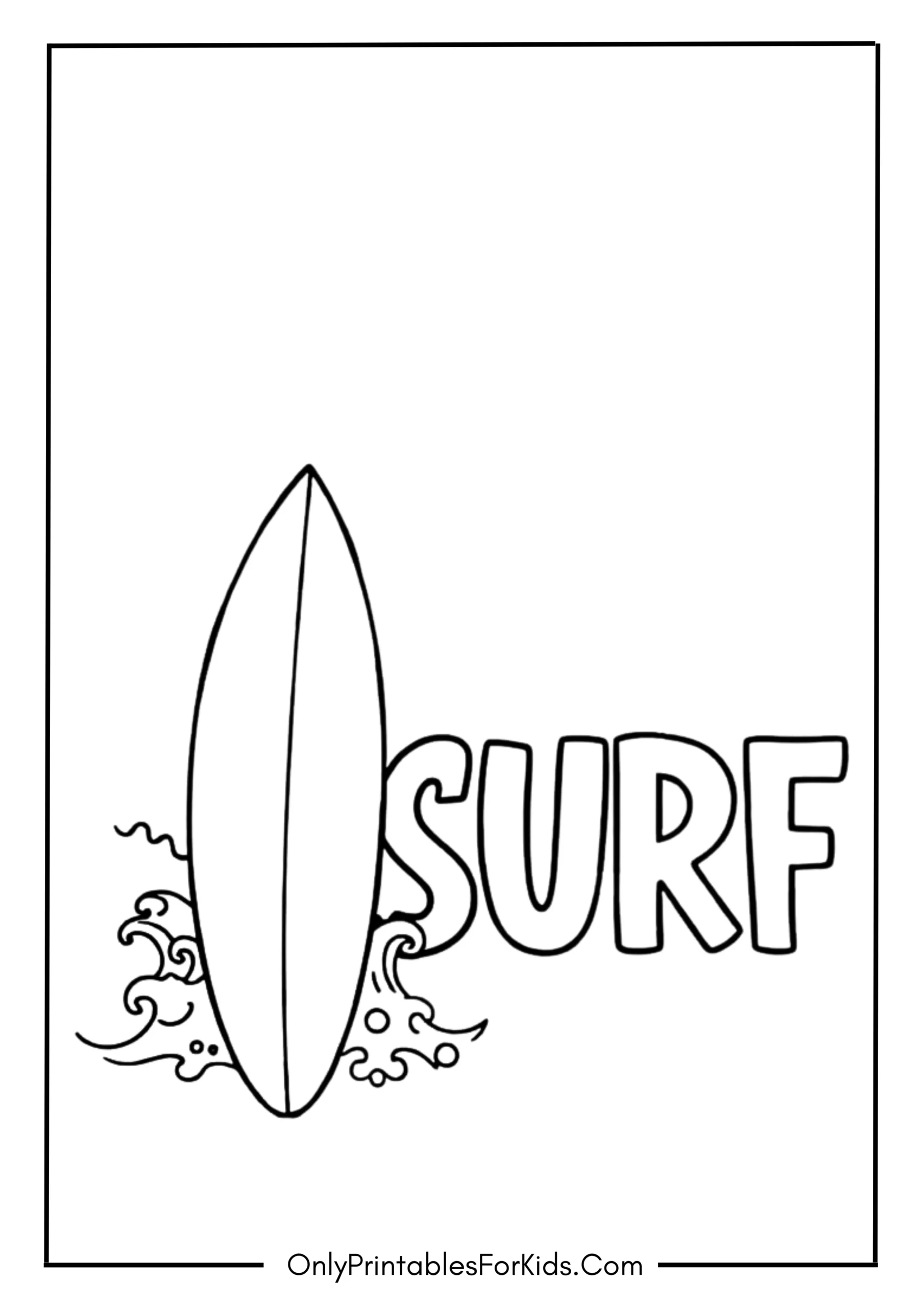 This coloring page shows a surfboard with the word “SURF.” Kids can color the board in stripes and make the ocean behind it blue.